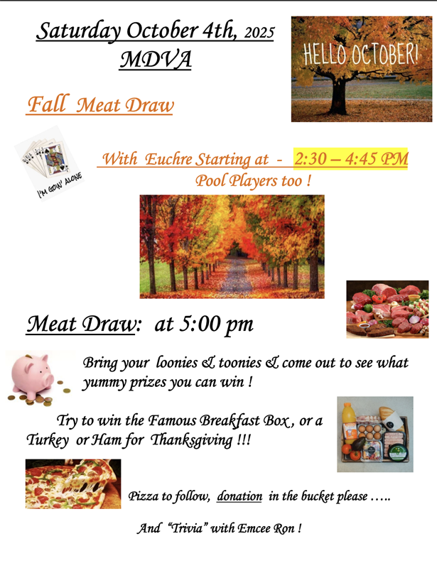 Meat Draw – October 4th Date/Time Date(s) - 04/10/20255:00 pm - 11:00 pm Location Club Room Categories MDVA CLUB EVENT